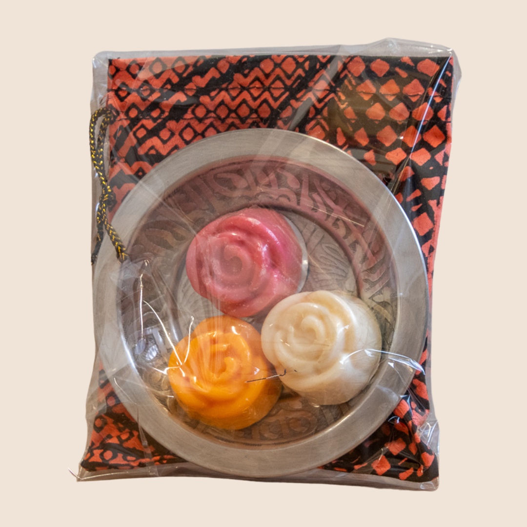 Wanneer de zepen in Nederland aankomen, verwerken wij deze vaak in leuke wellnes pakkjes om cadeau te doen. De zeepjes liggen op een hamanschaaltje met een cadeauzakje waar de niet gebruikte zeepjes in bewaard kunnen worden.