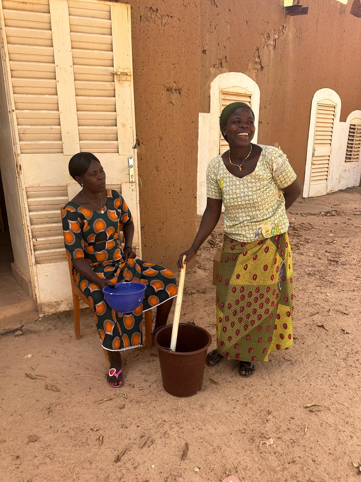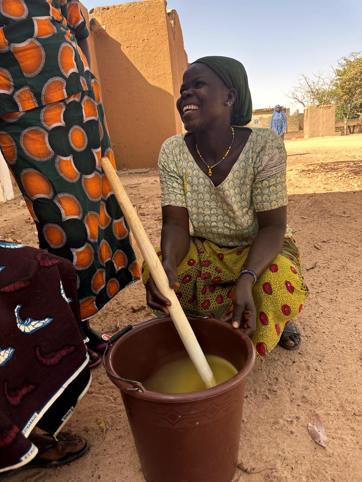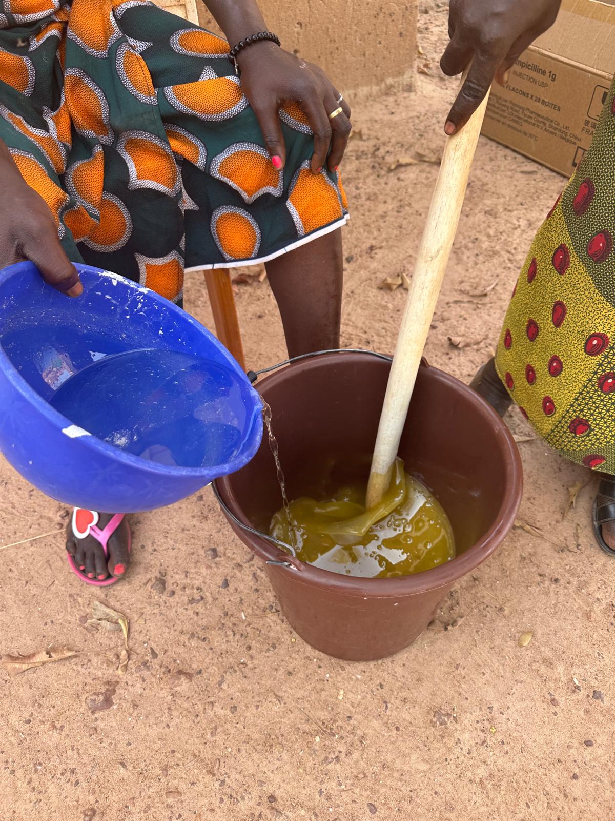 zware werk van het kraken van de noten, het fijnmalen en het wassen en kneden om er een vette substantie van te maken. Deze vette en pure karite is nu klaar om verder verwerkt te